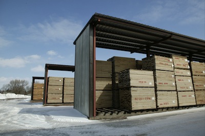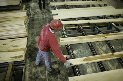 自然乾燥された丸太は製材工場にて板へとカットされます。